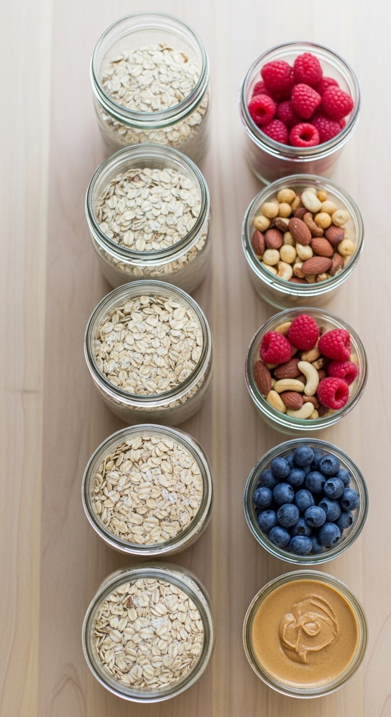 - Optional mix-ins for jars: fresh fruit, nut butter, nuts, seeds, cocoa powder, jams