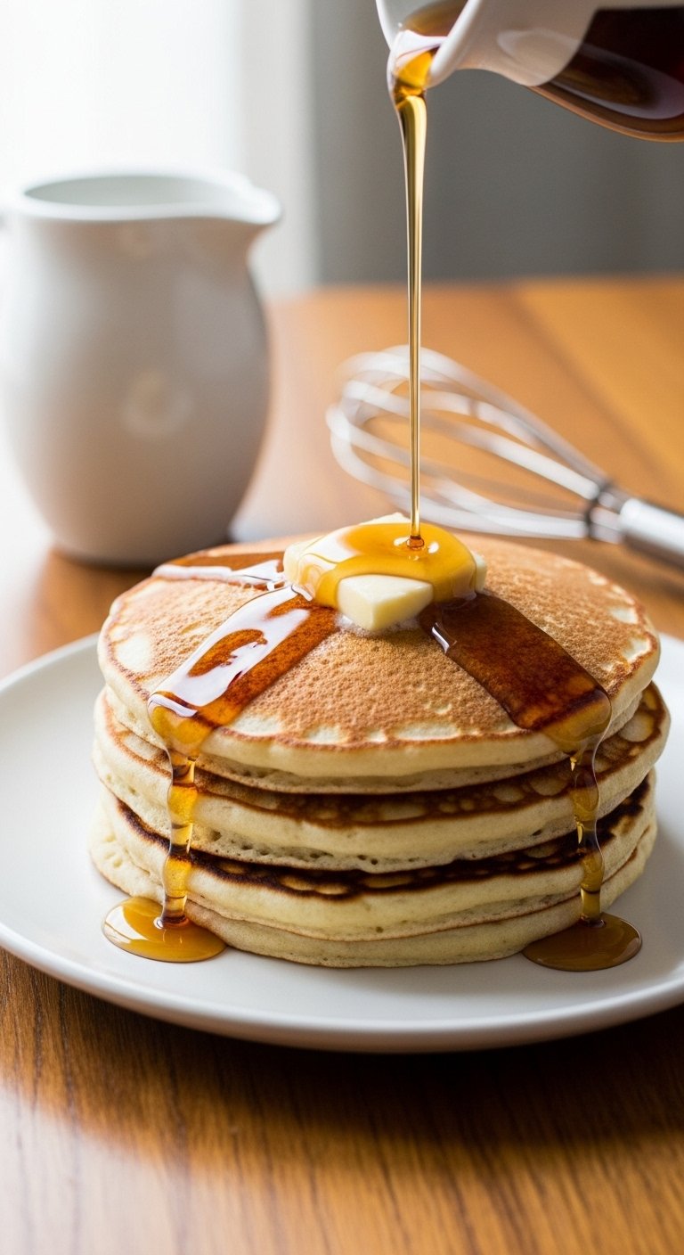 Stack tall and drizzle with warm maple syrup and a pat of butter. Garnish with fresh berries and a dusting of powdered sugar for a bakery look. Pair with strong coffee or maple latte. Leftovers keep in airtight containers in the fridge for up to 3 days; reheat in a toaster oven or skillet to restore crisp edges. For freezer meal prep, flash-freeze on a baking sheet, then store in a labeled bag.