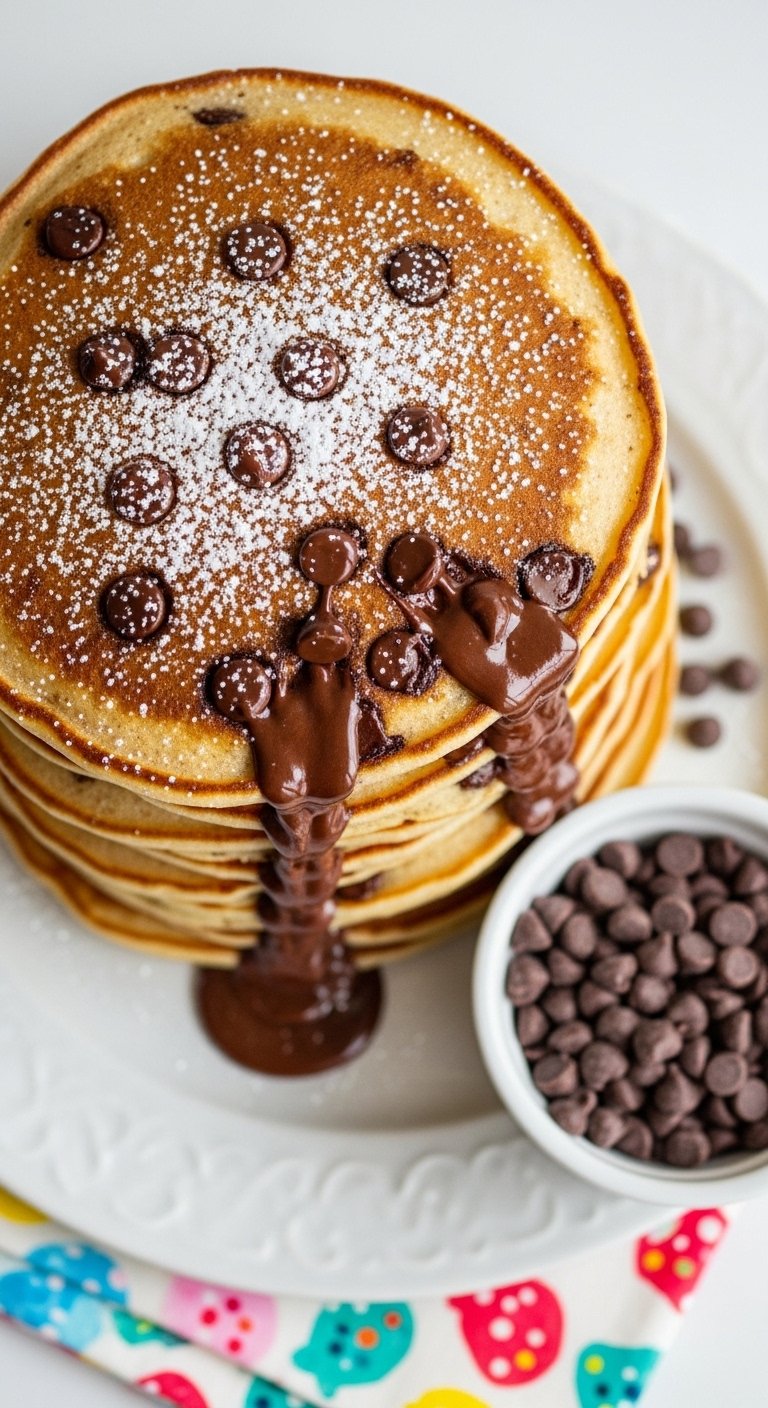 Serve with a light dusting of powdered sugar and fresh berries to cut the richness. A cold glass of milk or hot chocolate pairs well. Keep leftover pancakes in airtight containers for 2–3 days; reheat in a skillet to melt chips slightly.