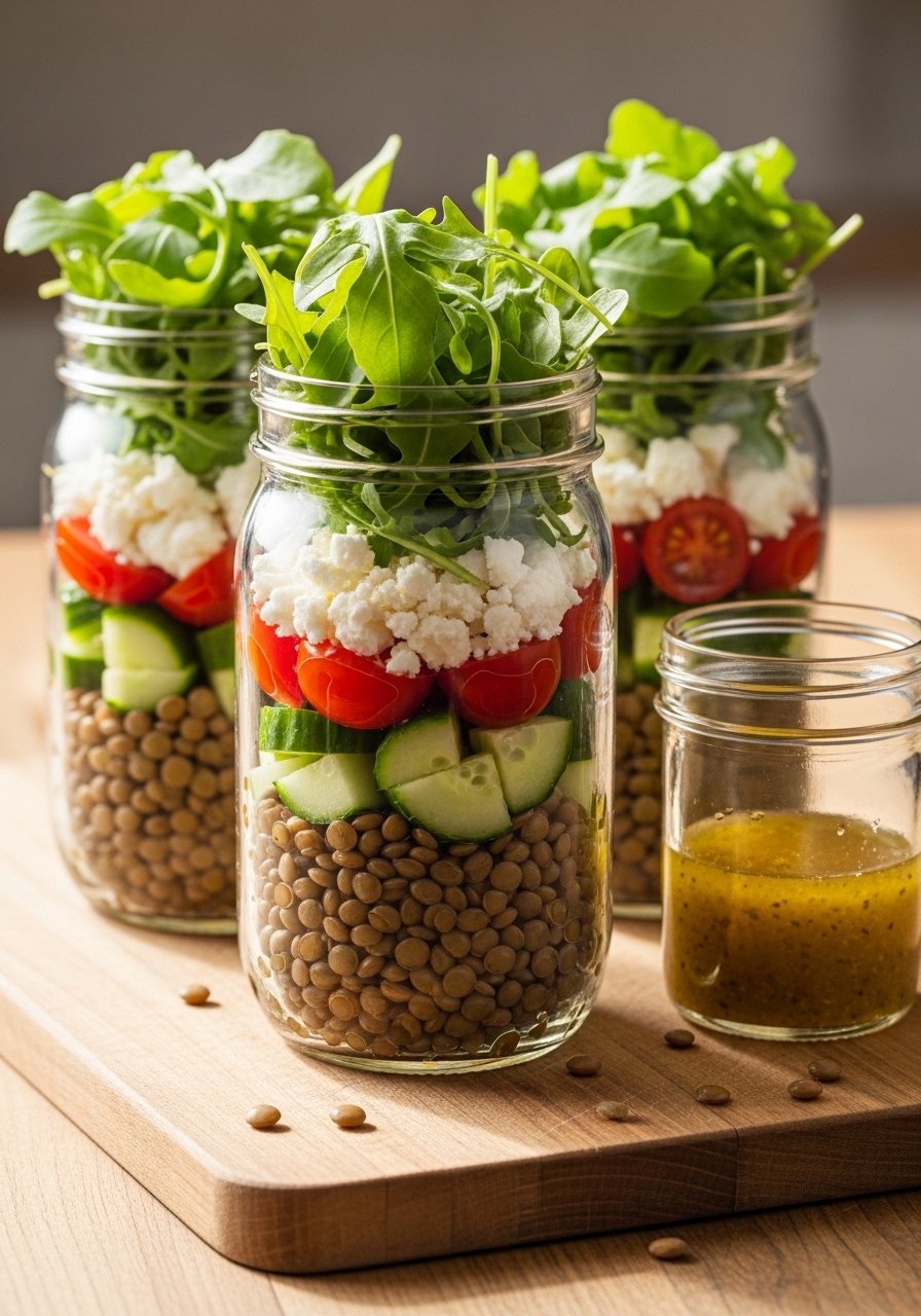 - In each jar, layer: dressing (bottom), lentils, bell pepper, cucumber, cherry tomatoes, red onion, feta, and arugula on top.
