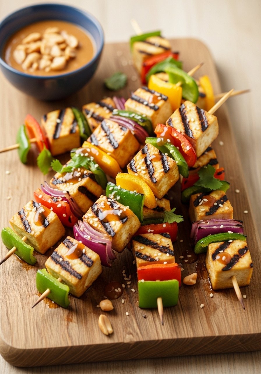 12. Tofu & Veggie Skewers with Peanut Dipping Sauce (High-Protein Vegan Snack)