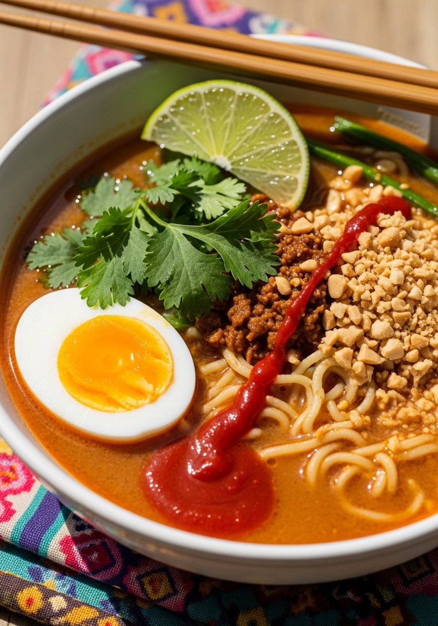 This spicy peanut ramen recipe blends creamy peanut flavor with vinegary lime and a hit of sriracha. It’s bright, nutty, and pleasantly spicy—an excellent choice if you want bold flavors and a quick prep time. The peanut element gives body to the broth without heavy cream.