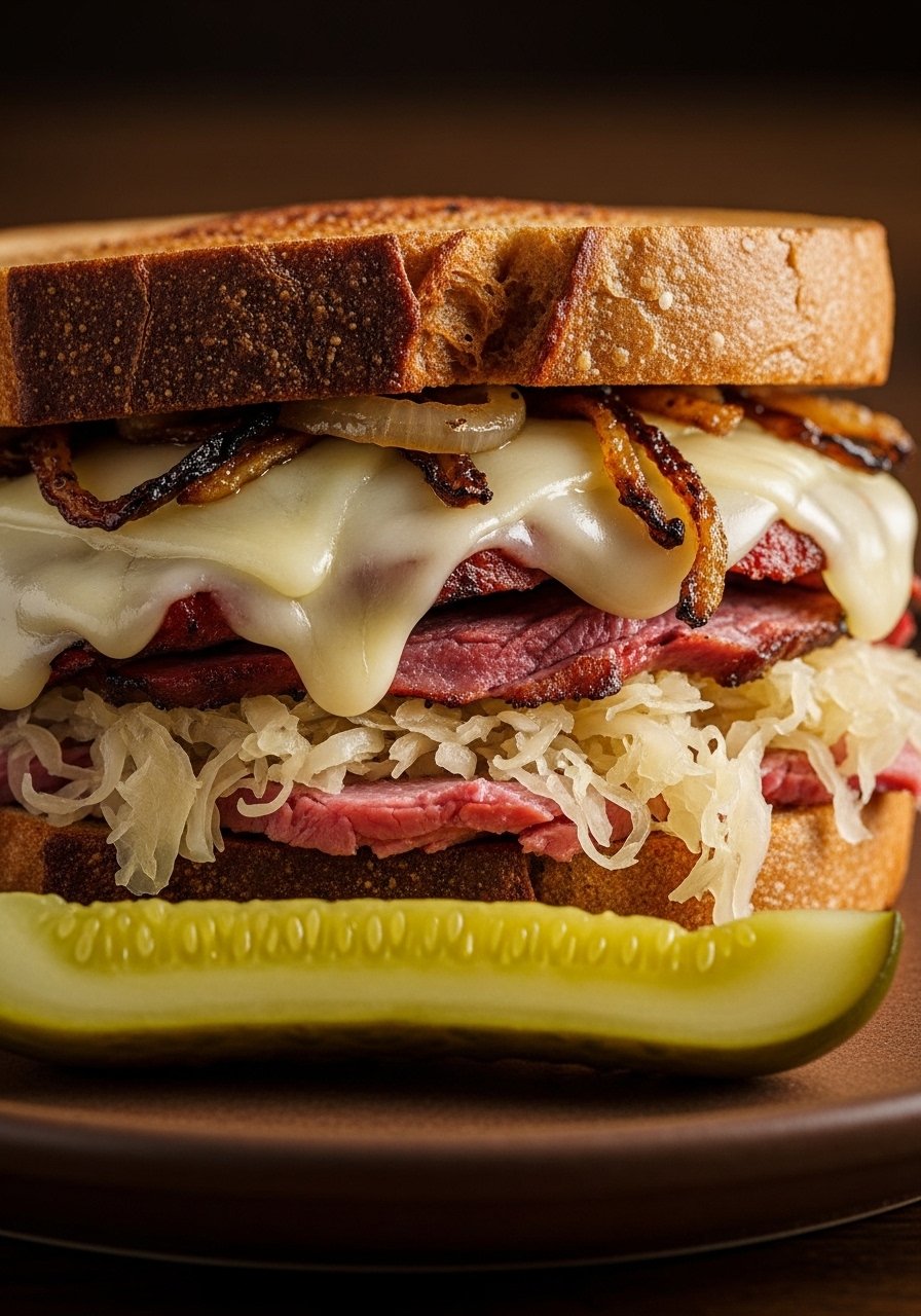 This Reuben improves on the classic by adding sweet caramelized onions and a homemade Thousand Island-style dressing for balanced tang and richness. Crisped rye on the outside and warm, melty insides make it a deli-level winner at home.