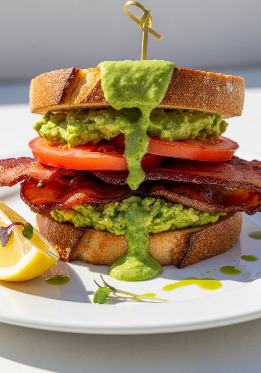 - Layer greens, tomato slices, bacon, and a drizzle of green sauce. Top with the other slice of sourdough.