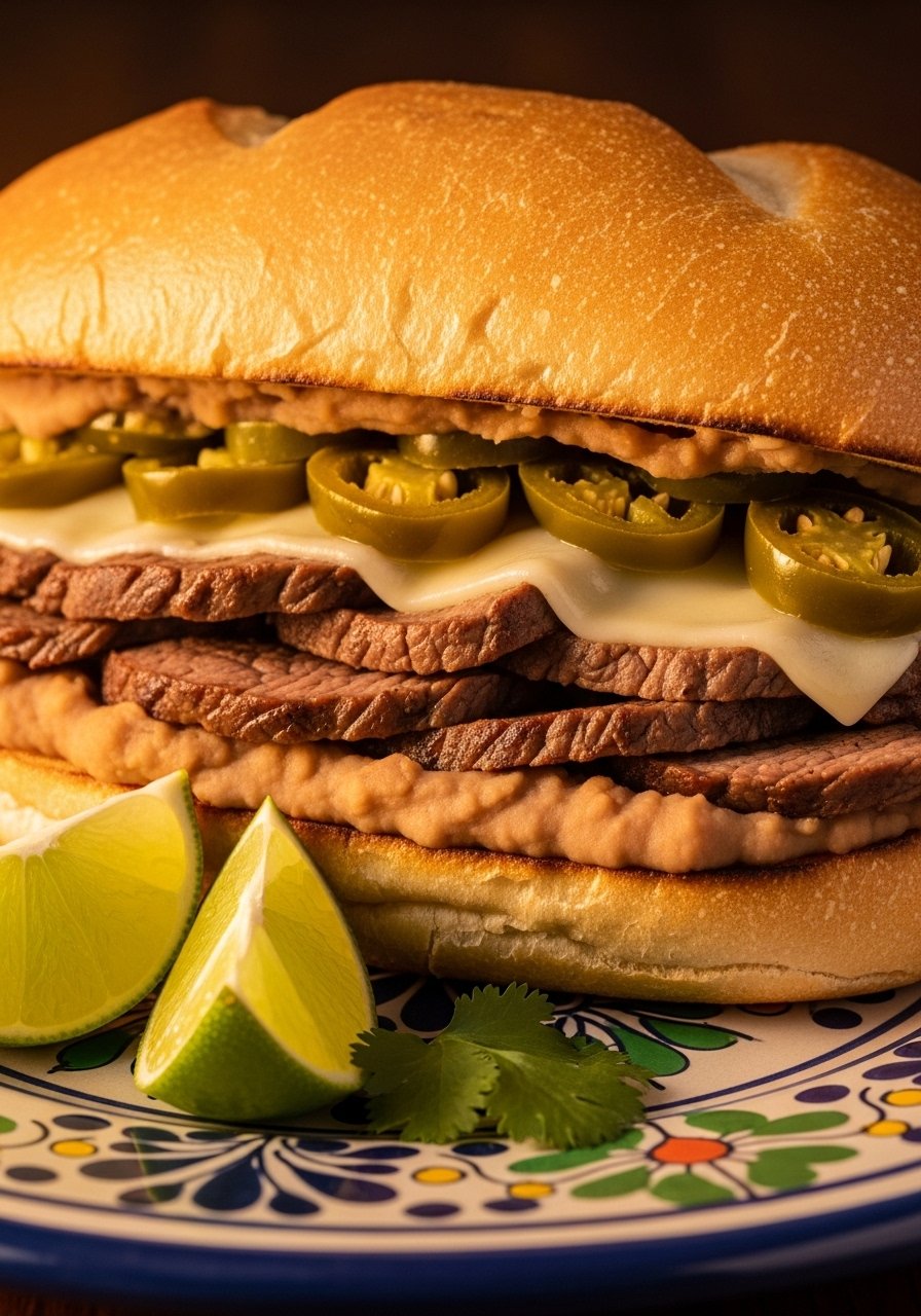 A Mexican-style steak torta is hearty, spicy, and full-flavored. Marinated sirloin and creamy refried beans make it a full meal. Add pickled jalapeños and a zesty mayo for balance.