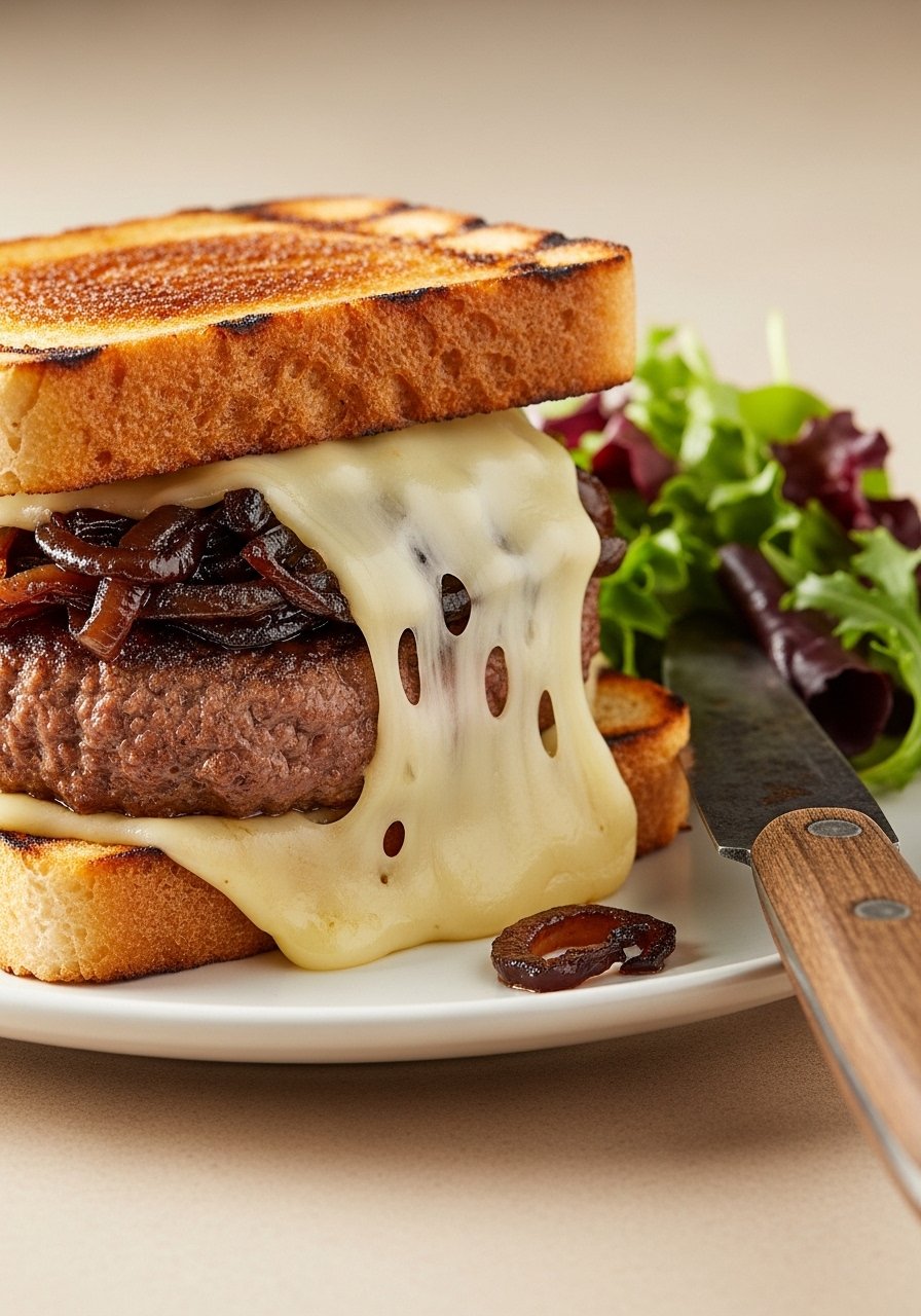 - Butter outer sides of rye slices. Assemble: cheese-topped patty and caramelized onions between two rye slices.