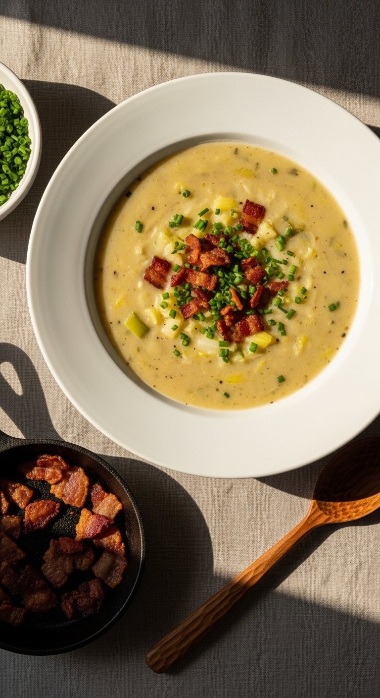 This classic potato leek soup is all about tender potatoes and the sweet, oniony smell of leeks. Crisp bacon adds a smoky contrast, and blending gives you a luxurious texture without heavy cream. It’s a comforting weeknight main that freezes well.