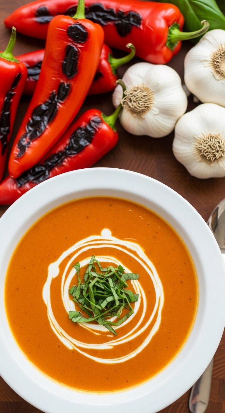 This roasted red pepper soup is bright and smoky with a hint of garlic. Roasting the peppers concentrates sweetness and adds charred complexity. Add a spoonful of crème fraîche or coconut milk for creaminess; lemon finishes it with a lift.
