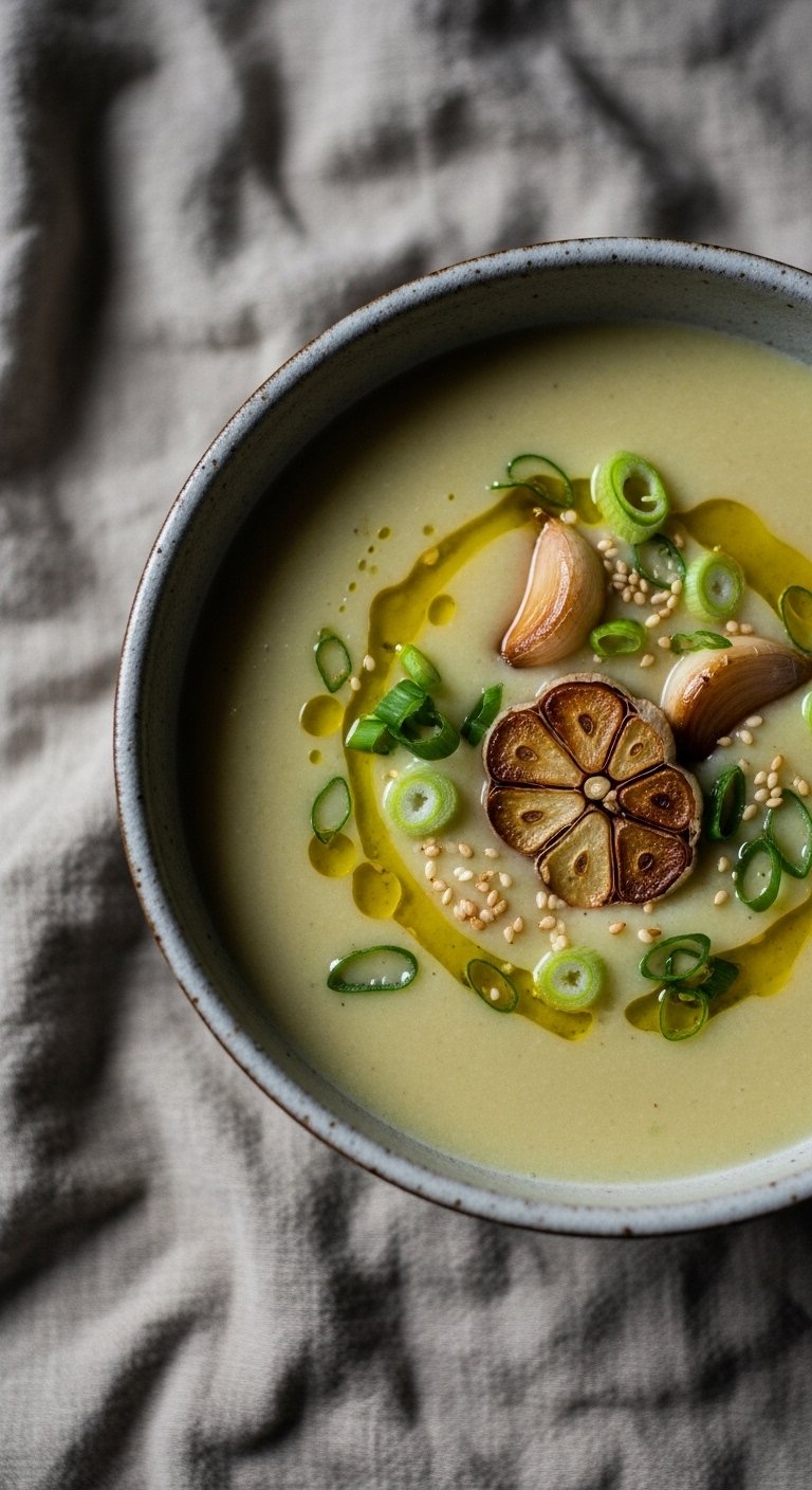 This cauliflower miso soup uses roasted cauliflower and miso paste for a savory, nutty flavor that feels indulgent but is plant-based. Roasting gives caramelized notes; miso layers in umami so it never tastes bland. It’s a good gateway to dairy-free creamy soups.