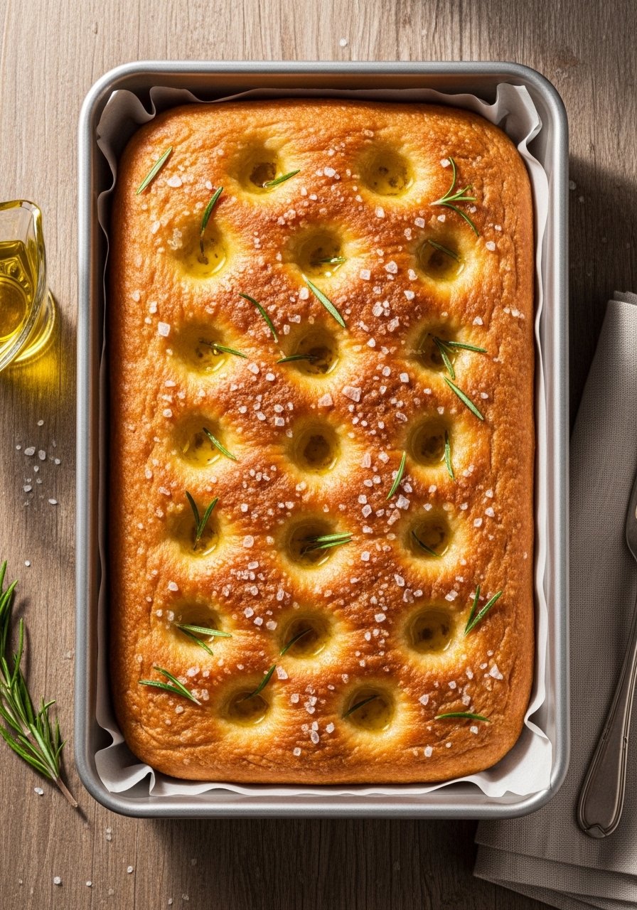 Focaccia is an easy, forgiving sourdough recipe that rewards hydration and gentle handling. The crumb is pillowy with crisp edges and a glossy olive oil finish. This version has aromatic rosemary and crunchy sea salt—perfect for dipping. Use a heavy-duty half-sheet pan so the edges brown evenly and you get those crisp corners.