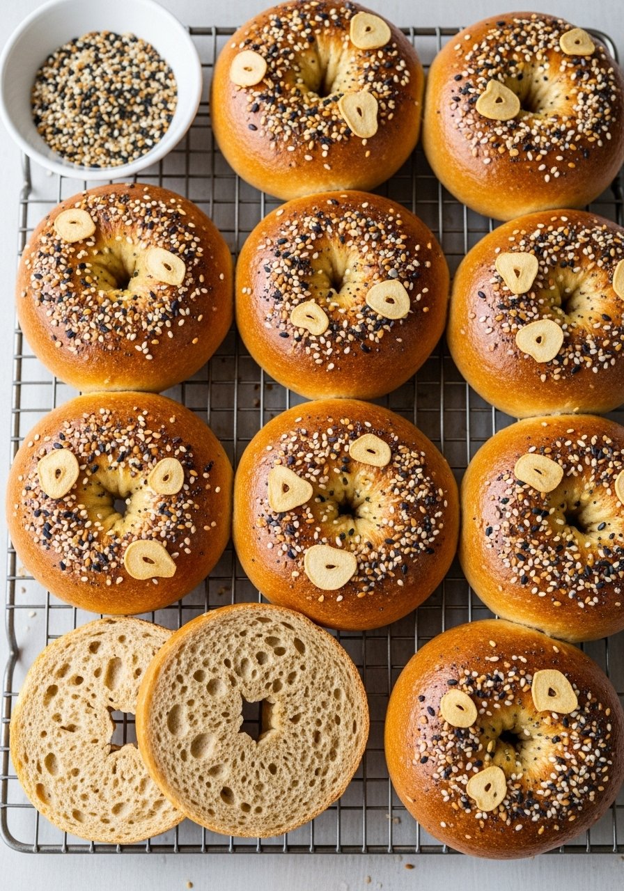 Bagels shine when you boil before baking: that step creates the signature shiny, chewy crust. Using a sourdough starter adds flavor and a slight tang. These are sturdy enough for thick spreads and hold up to toasting and sandwich fillings.