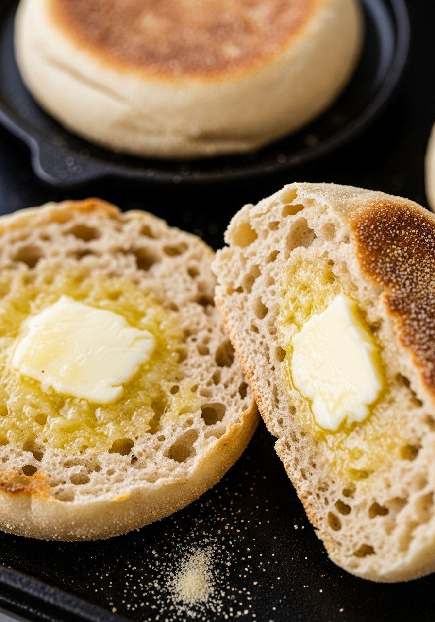 English muffins develop their signature nooks on a griddle. Using sourdough adds tang and a slightly chewier interior. Cooking on a flat, heavy griddle or cast iron gives even browning and consistent heat.