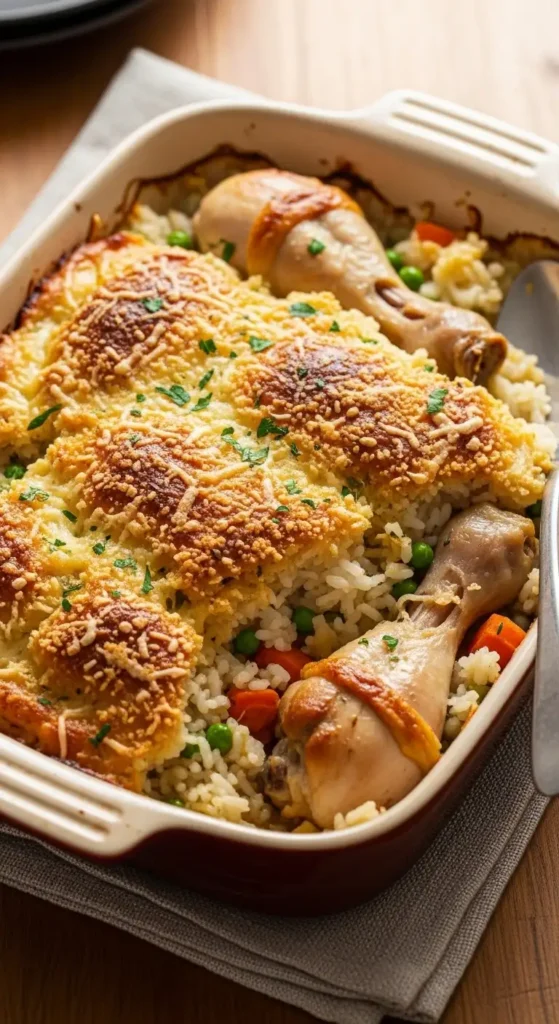 This bake brings chicken and rice together in one dish. Filling and easy. Perfect for family dinners. Minimal prep.
