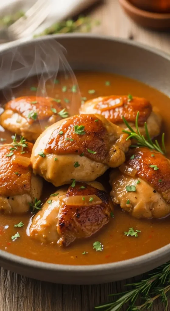 Serve with bread or potatoes. Spoon broth over chicken. Add herbs. Perfect for make-ahead meals. Comforting and warm.