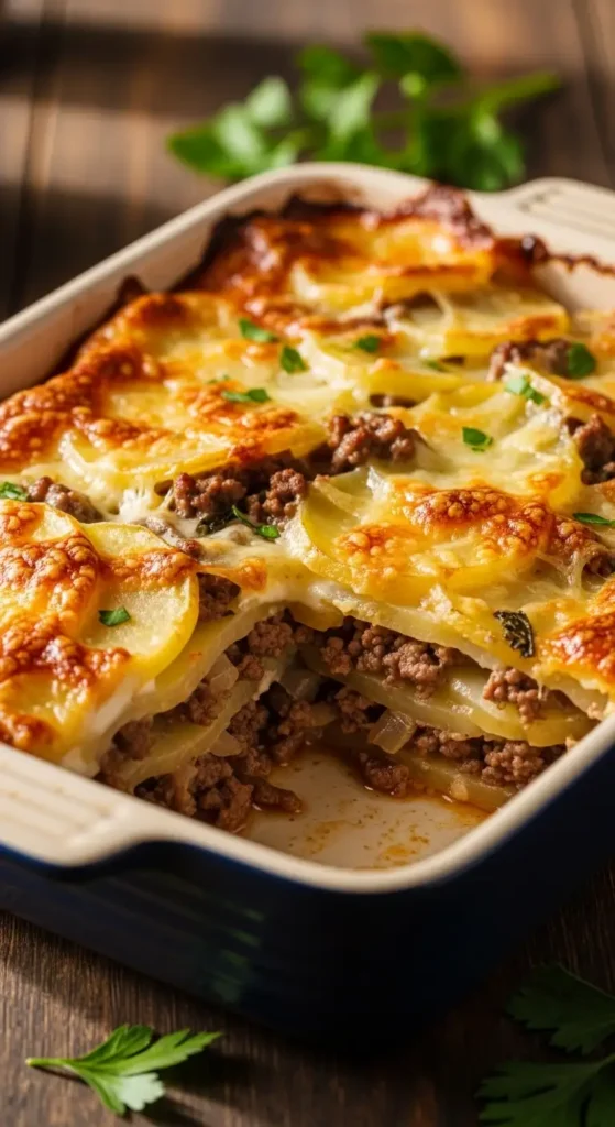 Thin potato slices bake over seasoned beef for a satisfying bake.