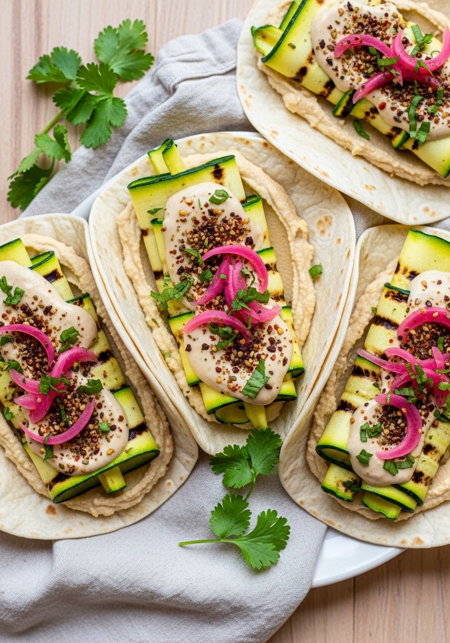 These summer squash tacos celebrate garden produce with Mediterranean flavors — hummus, tahini, and za’atar pickled shallots. They’re light but satisfying, with creamy hummus and roasted squash giving contrast. Perfect for a summer taco night or as a meatless main that even meat-eaters will enjoy. A sheet pan makes it hands-off and easy.