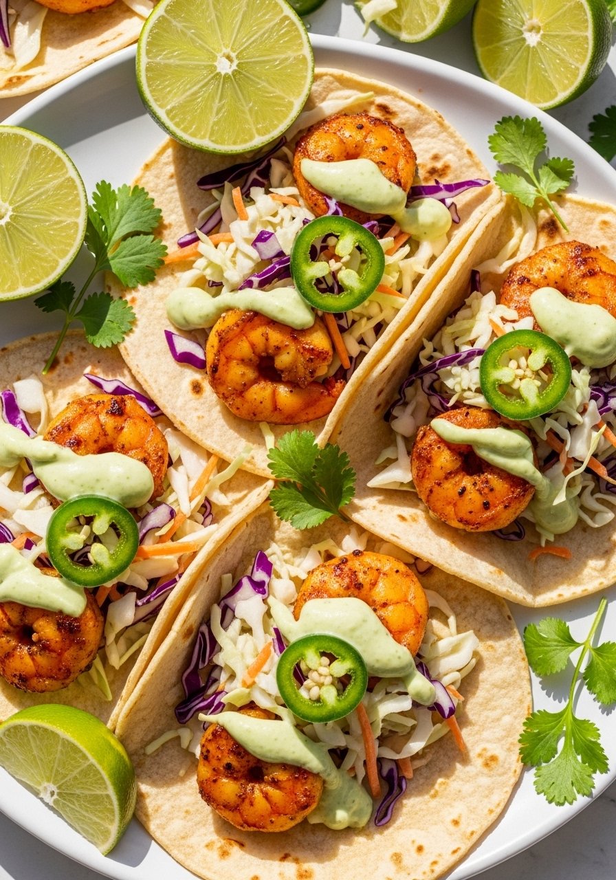 Quick, bright, and just a little smoky, these garlic-lime shrimp tacos are the definition of easy shrimp tacos. Shrimp marinate briefly so they stay tender and cook in minutes, making this a perfect weeknight option. A creamy jalapeño-garlic crema cools the heat and a crisp cabbage slaw adds crunch. Use a non-stick or stainless steel skillet for fast searing.