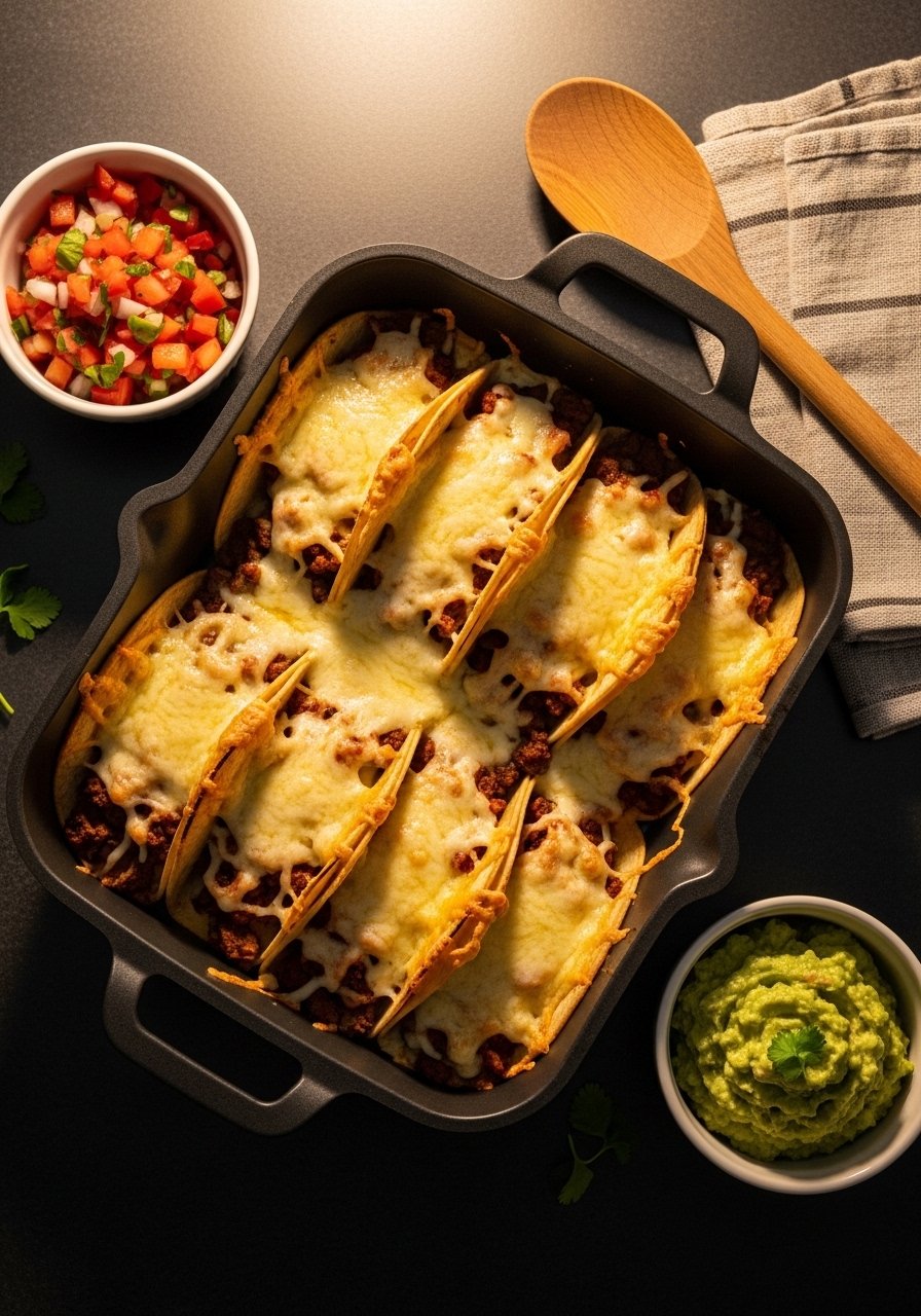 This cheesy oven-baked taco recipe is a family weeknight favorite — minimal hands-on time and maximum comfort. Ground beef simmers with garlic and taco seasoning, then is baked in tortillas topped with cheese until melty and crispy at the edges. A ceramic nonstick pan or rimmed baking dish works perfectly.