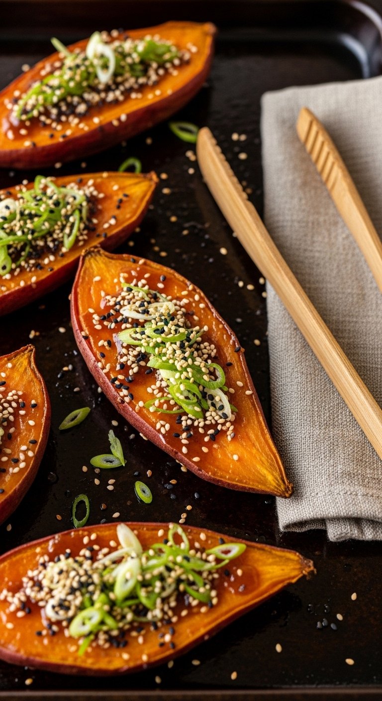 This sheet-pan side tastes like restaurant fusion with minimal fuss: the skins caramelize, the glaze turns sticky, and toasted sesame adds nutty depth. Sweet, salty, and a little smoky, it’s a crowd-pleaser next to rice bowls or as a hearty snack. If you love sweet-potato texture and crunchy edges, you’ll love how hands-off this is.