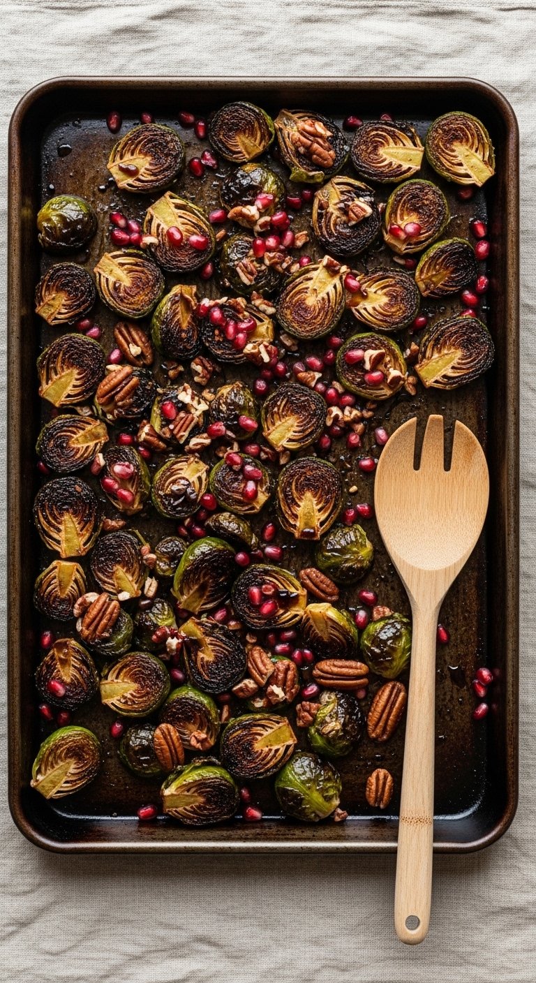 Serve warm as a side or toss into a grain bowl with quinoa and roasted beets. Garnish with extra nuts and pomegranate for color. Store cooled sprouts in glass meal prep containers up to 4 days; reheat in a hot oven or air fryer for crisp edges. This makes a great make-ahead roast for busy holiday spreads.